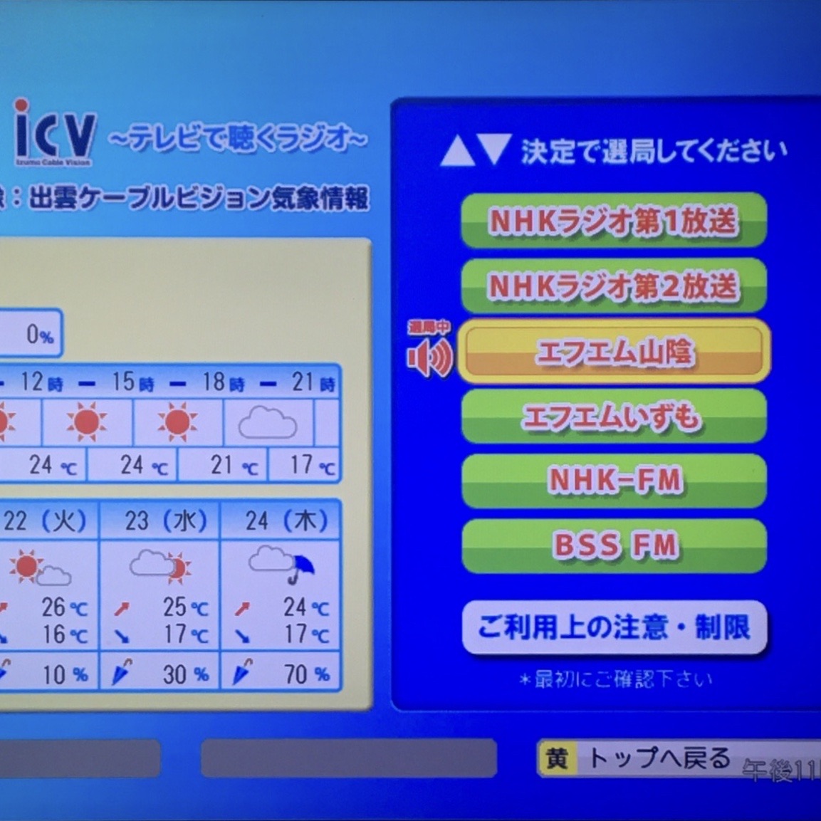 2020年09月19日 テレビで聴くラジオ 出雲ケーブルビジョンでは、ICVチャンネルのDボタンでNHKと民放FMのラジオが聴けます。 「出雲」カテゴリの最新記事 < 前の記事次の記事 > コメント コメント一覧 (2) 1. ステレオ 2020年12月18日 17:04 ICVはテレビ信号にFMラジオを混合しておられて、外部端子のあるラジオにつなぐと良い音で聴けるので、特に山間地域に人には知ってもらいたいです。 0 ibm693 がしました 2. DX流星塵 2022年03月21日 13:35 >>ステレオさん 情報、ありがとうございます。 0 ibm693 がしました コメントフォーム 名前 コメント 記事の評価 リセット リセット 顔 星 情報を記憶 コメントを投稿する